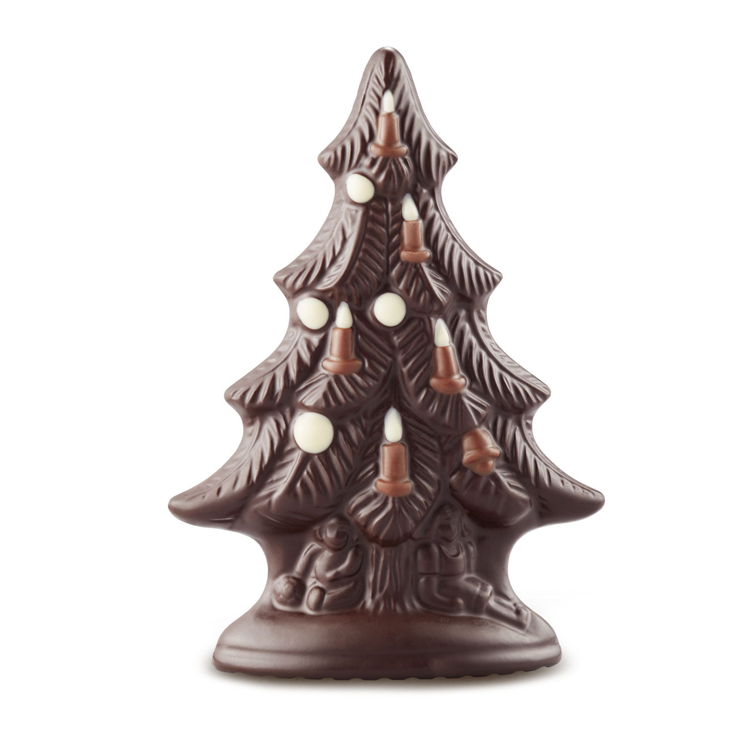 Świąteczna choinka wykonana z czekolady gorzkiej, udekorowana czekoladą mleczną i białą. Idealna jako prezent na Mikołajki i Święta Bożego Narodzenia. Czekoladowe figurki z Pracowni Maestro Czekolady E.Wedel to tworzone z pasją, ręcznie wykonane małe dzieła sztuki. Dzięki swojej unikalności i wyraźnej symbolice są idealnym pomysłem na świąteczny prezent.