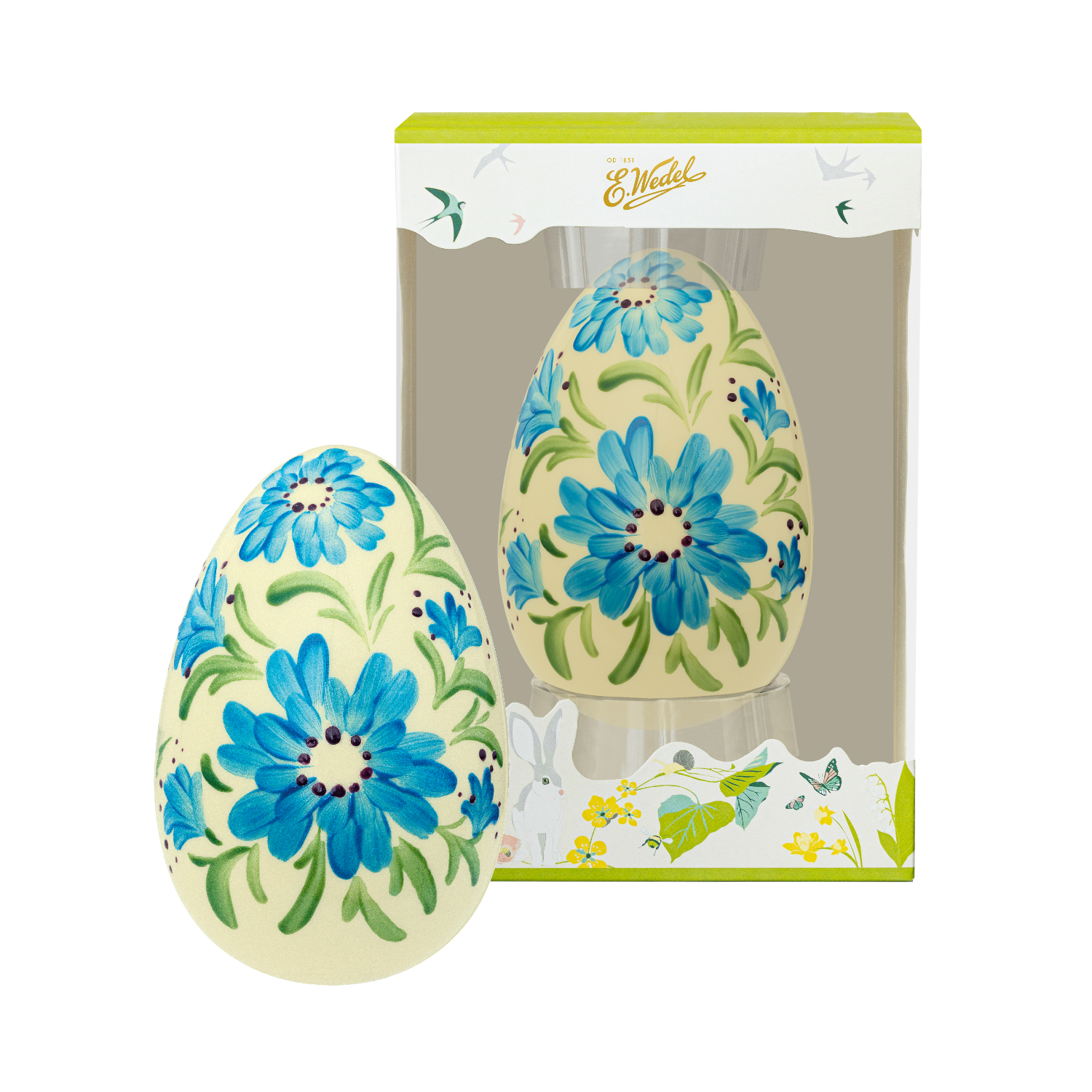 Piękna, ręcznie dekorowana pisanka z nowoczesnym wzorem. Wykonana z czekolady białej E.Wedel, udekorowana ręcznie malowanymi kwiatami. Każda pisanka jest wyjątkowa, ponieważ naniesiony na nią wzór jest wykonany ręcznie. Idealny pomysł na elegancki wielkanocny prezent który z pewnością zapadnie w pamięci obdarowanej nim osobie. Pięknie prezentuje się w wielkanocnym koszyczku, czy jako unikatowa i oryginalna ozdoba na świątecznym stole. Zapakowany w kartonowe pudełko w kolorze biało-zielonym z wielkanocnym kwiatowym wzorem. Wielkanocne figurki z czekolady E.Wedel to małe dzieła sztuki, tworzone z pasją przez zespół wykwalifikowanych cukierników, zostały wykonane ręcznie w Pracowni Ręcznej Produkcji Rarytasy.