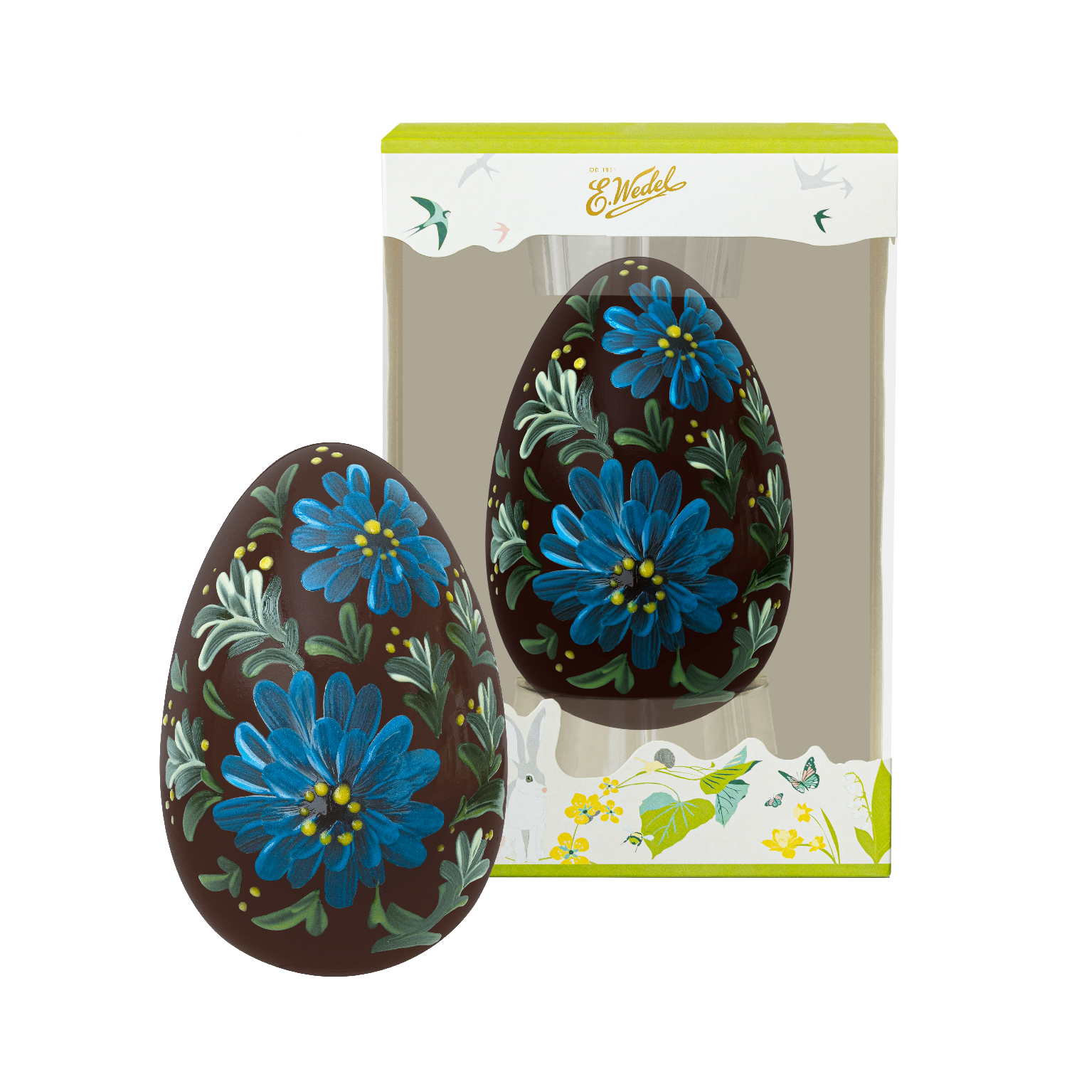 Piękna, ręcznie dekorowana pisanka z nowoczesnym wzorem. Wykonana z czekolady gorzkiej E.Wedel, udekorowana ręcznie malowanymi kwiatami. Każda pisanka jest wyjątkowa, ponieważ naniesiony na nią wzór jest wykonany ręcznie. Idealny pomysł na elegancki wielkanocny prezent który z pewnością zapadnie w pamięci obdarowanej nim osobie. Pięknie prezentuje się w wielkanocnym koszyczku, czy jako unikatowa i oryginalna ozdoba na świątecznym stole. Zapakowany w kartonowe pudełko w kolorze biało-zielonym z wielkanocnym kwiatowym wzorem. Wielkanocne figurki z czekolady E.Wedel to małe dzieła sztuki, tworzone z pasją przez zespół wykwalifikowanych cukierników, zostały wykonane ręcznie w Pracowni Ręcznej Produkcji Rarytasy.