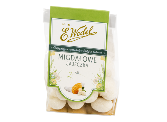Małe, wielkanocne jajeczka przygotowane z oryginalnej wedlowskiej czekolady białej. Każde z nich skrywa pyszny, migdał oblany białą wedlowską czekoladą z dodatkiem wiórków kokosowych.