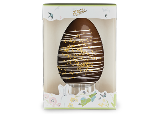 Piękna, ręcznie dekorowana pisanka z nowoczesnym wzorem. Wykonana z czekolady gorzkiej E.Wedel, dekorowana czekoladą białą i złotą cukrową dekoracją. Każda pisanka jest wyjątkowa, ponieważ naniesiony na nią wzór jest wykonany ręcznie. Idealny pomysł na elegancki wielkanocny prezent który z pewnością zapadnie w pamięci obdarowanej nim osobie. Pięknie prezentuje się w wielkanocnym koszyczku, czy jako unikatowa i oryginalna ozdoba na świątecznym stole. Zapakowany w kartonowe pudełko w kolorze kremowo-zielonym z wielkanocnym kwiatowym wzorem. Wielkanocne figurki z czekolady E.Wedel to małe dzieła sztuki, tworzone z pasją przez zespół wykwalifikowanych cukierników, zostały wykonane ręcznie w Pracowni Ręcznej Produkcji Rarytasy.
