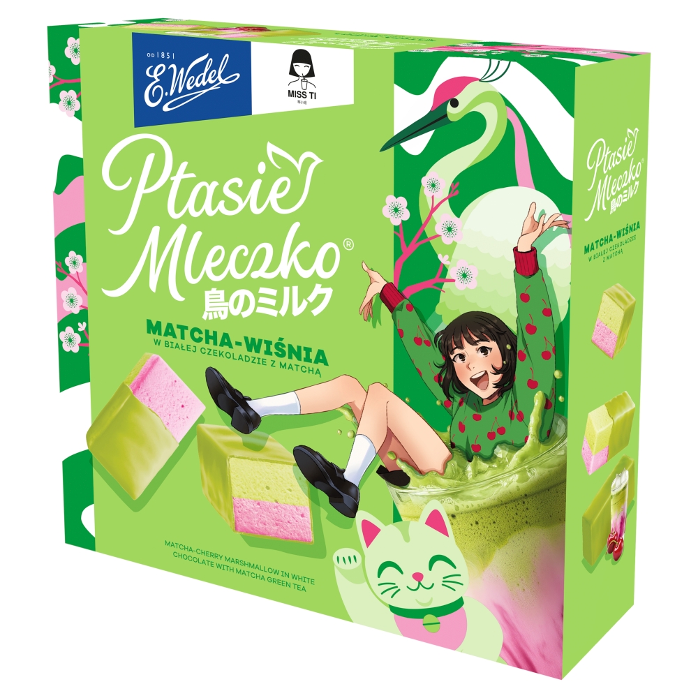 Ptasie Mleczko i Miss Ti połączyło to, co najlepsze: puszyste pianki z miłością do Japonii, tworząc wyjątkowe, zielone Ptasie Mleczko matcha-wiśnia.