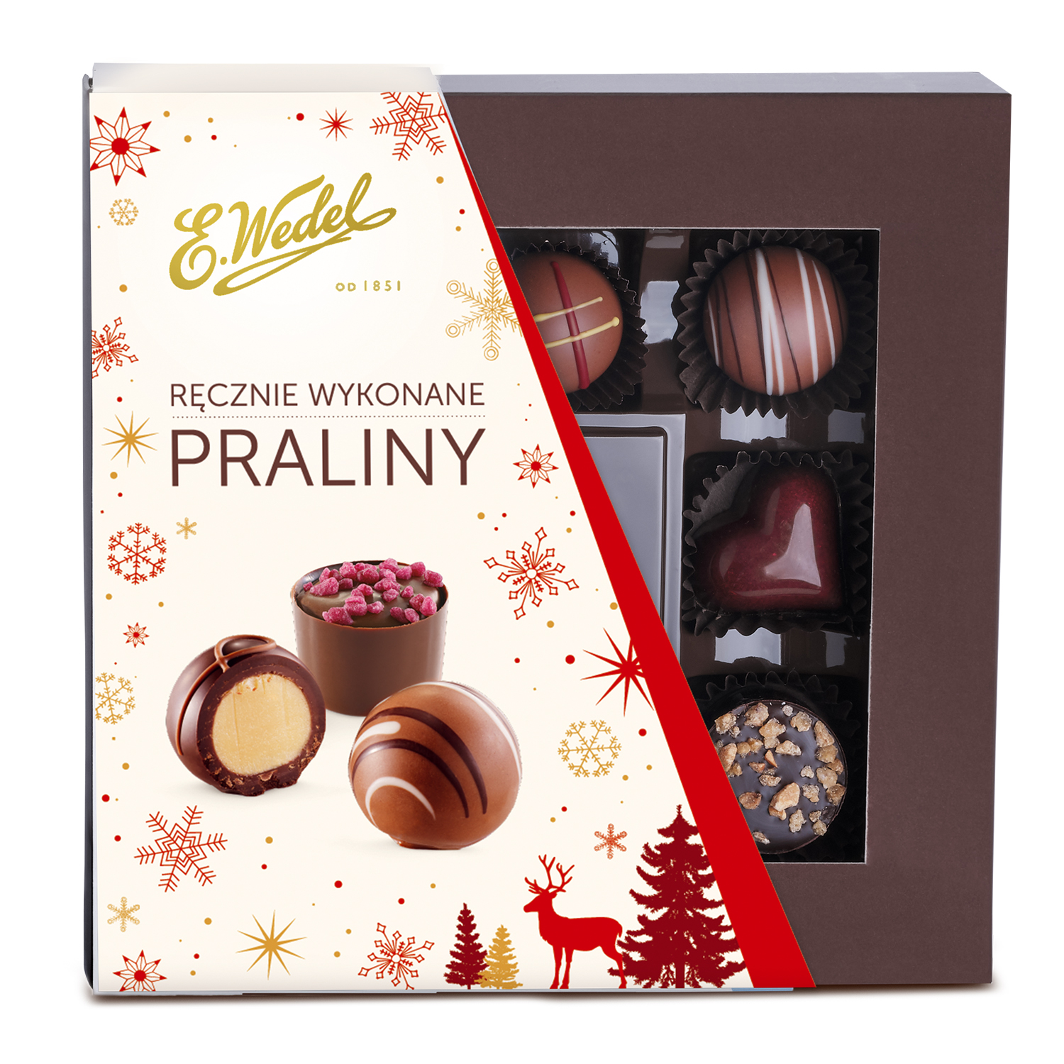 Ręcznie robione praliny od E.Wedel to doskonała czekolada i wyśmienite nadzienia. Wykonane według receptur Maestro Czekolady, łączą w sobie aksamitny smak z najwyższą jakością i wyrafinowaniem. Zapakowane w eleganckie pudełko z okienkiem, pokazującym dostępne smaki pralin i gustowną obwolutą. Z pewnością będą pysznym prezentem, jeśli chcesz obdarować kogoś wyjątkowym upominkiem. W zestawie znajduje się 8 pralin: likier czekoladowy, orzech laskowy, orzech włoski, mocna kawa, marakuja, serce różane x2, chili.
