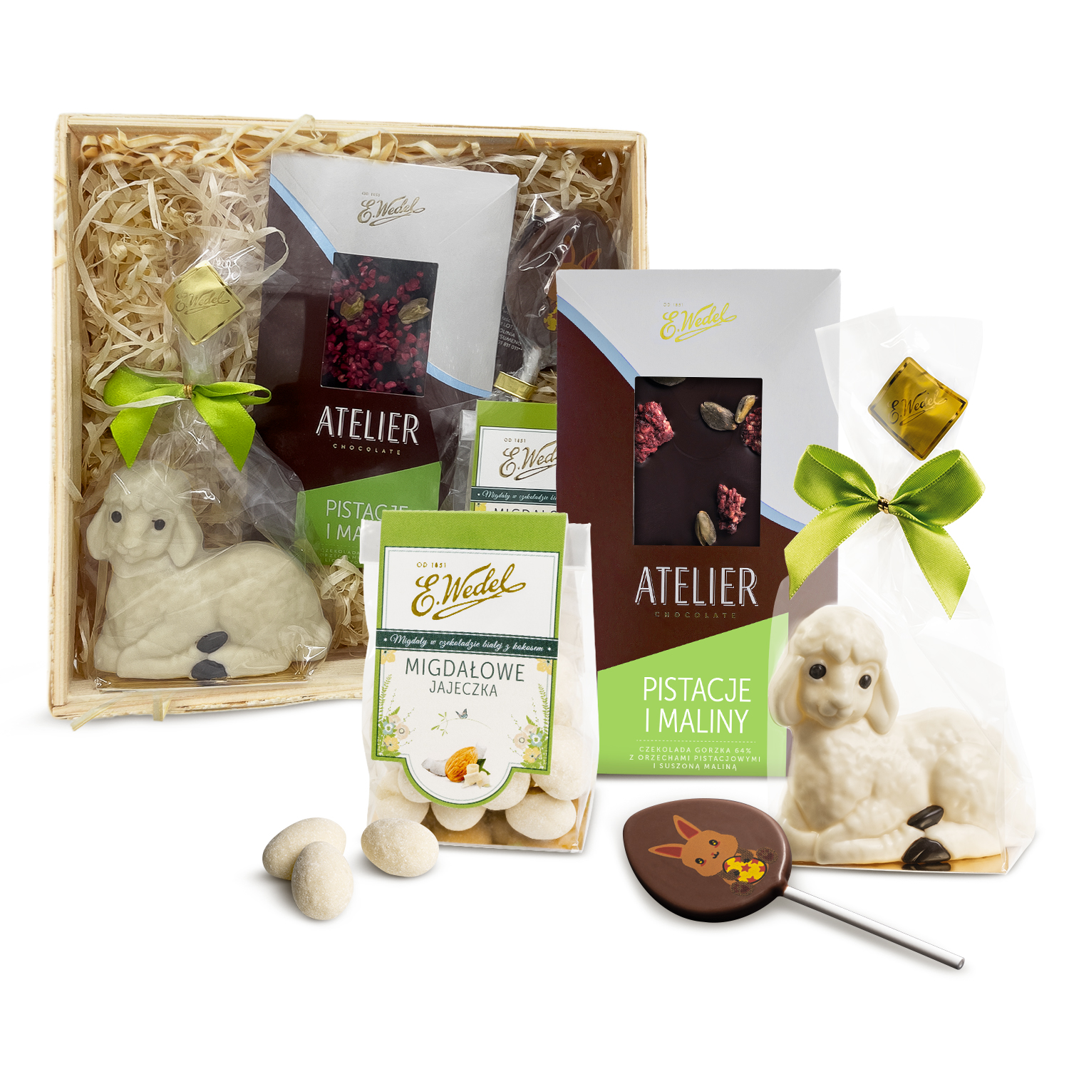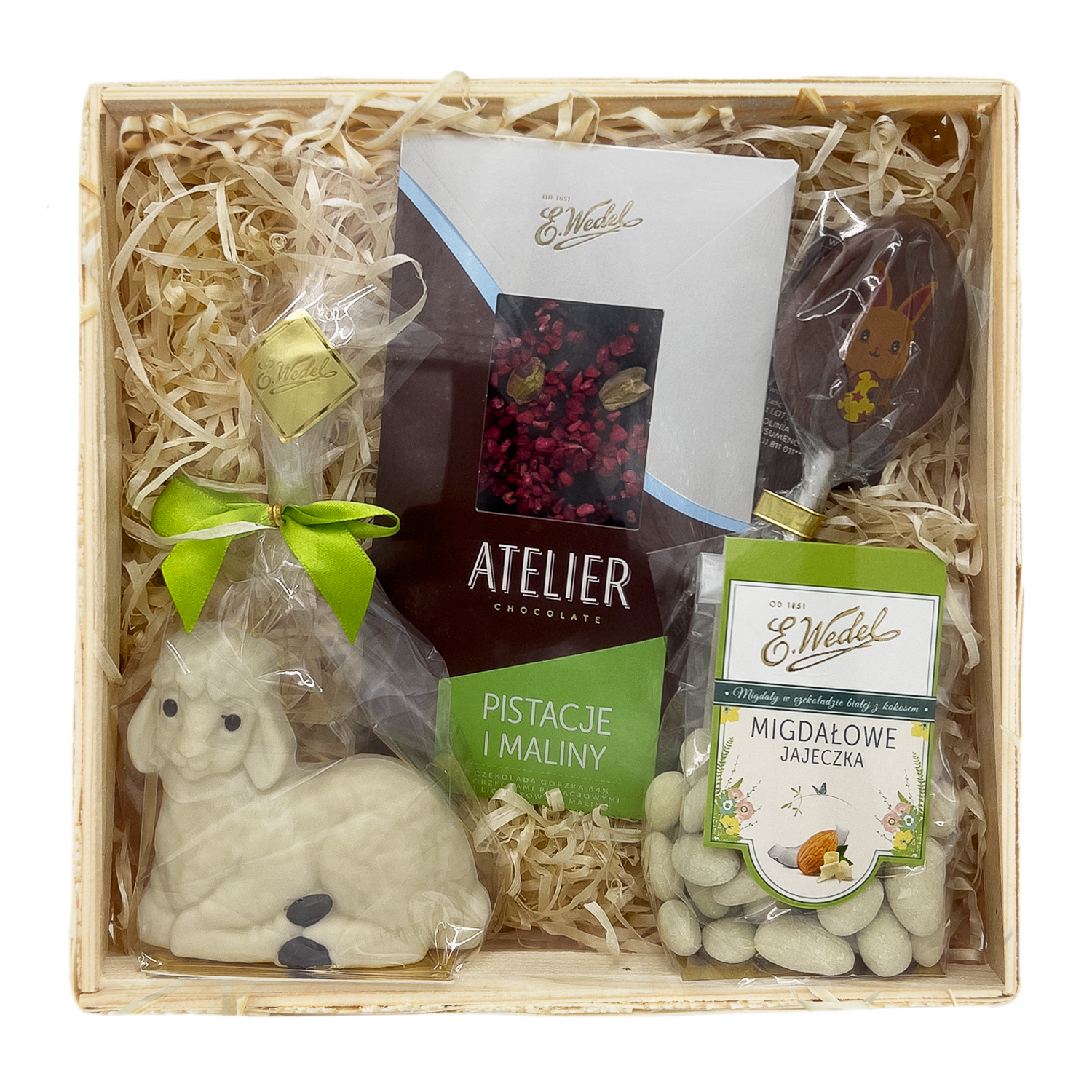 Wielkanocny zestaw prezentowy w ozdobnym koszu prezentowym, wypełniony unikatowymi, ręcznie robionymi produktami z czekolady, wykonanymi w Pracowni Ręcznej Produkcji Rarytasy E.Wedel. Idealnie sprawdzi się jako słodki prezent na Wielkanoc dla najbliższych.
